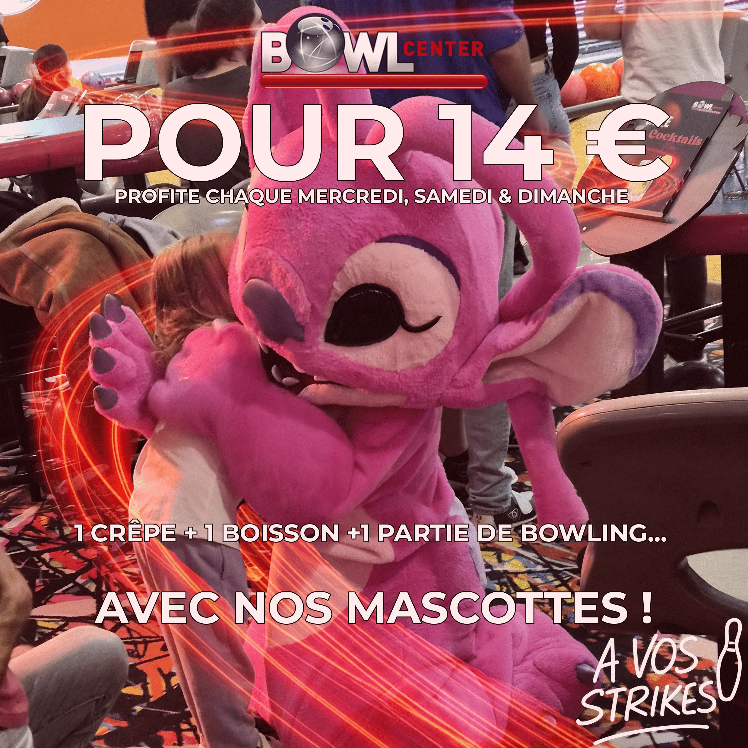 1 partie de bowling + 1 crêpe + 1 boisson : 14 €