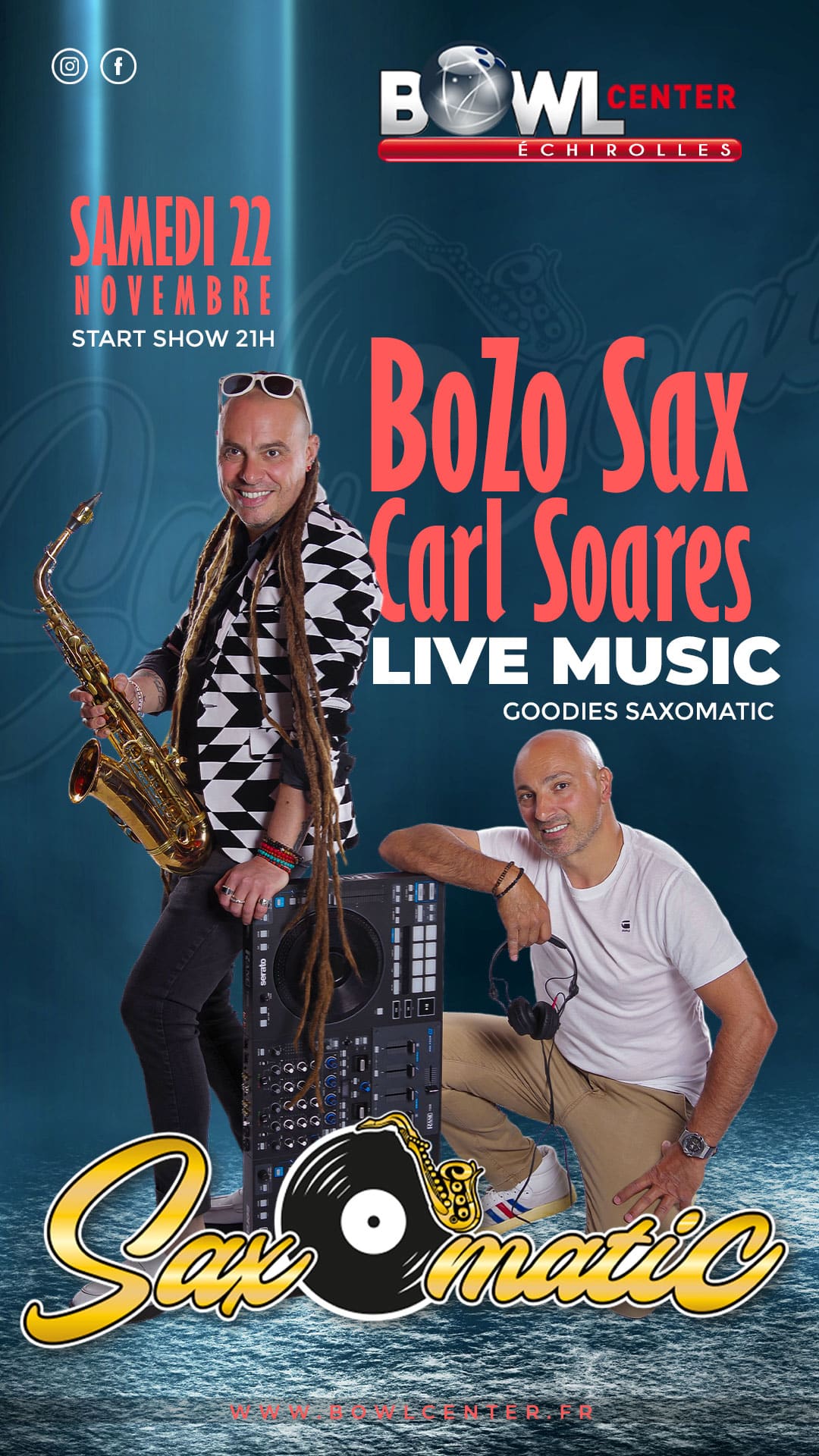Restez connectés avec Bowlcenter et ne manquez aucune actu ! Offres spéciales, soirées à thème, coulisses, photos exclusives et événements à venir : tout se passe sur nos réseaux. Suivez-nous sur Facebook & Instagram pour connaître nos événements et plonger dans l’ambiance en images, et sur LinkedIn pour nos actualités professionnelles et offres d’emploi.
