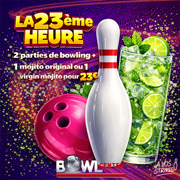 La 23ème Heure, c’est notre nouvelle offre nocturne dédiée aux amateurs de bowling ! Tous les vendredis et samedis à partir de 23h, profitez de 2 PARTIES DE BOWLING + 1 MOJITO ORIGINAL OU 1 VIRGIN MOJITO pour seulement 23 €. Une occasion parfaite de prolonger la soirée, de défier vos amis et de vivre l’ambiance unique du bowling de nuit. 🎳🌙